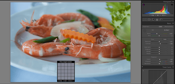De witbalans van een RAW foto is eenvoudig aan te passen in Lightroom zonder dat de kwaliteit van de foto beïnvloed wordt. Hiervoor vind je in de ontwikkelmodule twee schuifbalken, namelijk kleurtemperatuur en tint. Door deze balkjes te verschuiven is het mogelijk om de foto warmer of kouder van kleur te maken. Soms kan het lastig zijn om de juiste balans te vinden en de pipet kan een handige en snelle oplossing zijn om de witbalans goed in te stellen. Door met een pipet op een neutrale lichtgrijze kleur te klikken in je foto wordt de witbalans van de foto aangepast. De pipet vind je links boven de twee schuifbalkjes waar de witbalans aan te passen is. Door met de pipet op de foto te staan zie je direct een uitvergroting verschijnen waar je goed kunt zien wat de kleur van de pixels is. Dit is in onderstaande afbeelding te zien. Ook in dit geval is de navigator weer te gebruiken om het resultaat te zien voordat je eenmaal klikt.