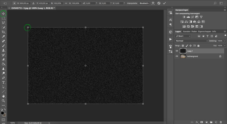 Kies linksboven voor het gereedschap “verplaatsen” en maak de ruislaag nu groter door het linker puntje uit te trekken.