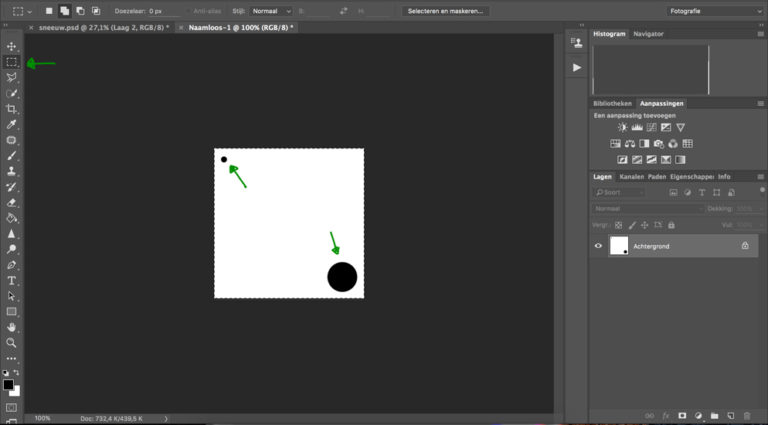 Maak een klein stipje (van 20px) in de linkerbovenhoek. En een grote stip (100px) rechts onderin. Selecteer vervolgens de stippen met de selectietool of met Ctrl+A.