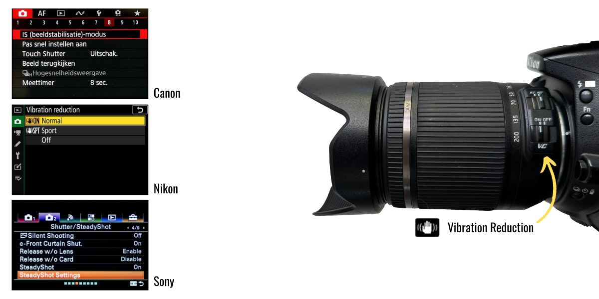 Grote kans dat op jouw objectief zich een beeldstabilisatie schakelaar bevindt. Heb je een Canon-camera? Dan is de optie te herkennen aan de afkorting IS (Image Stabilization). Voor Nikon-camera’s moet je op zoek gaan naar de afkorting VR (Vibration Reduction). Voor Sony-gebruikers wordt de optie vaak weergegeven onder de naam SteadyShot of Optical SteadyShot (OSS). Maar ook VC (Vibration Correction), OIS (Opticam Image Stabilization) en IBIS (In Body Image Stabilization) zijn afkortingen die regelmatig voorkomen, hoewel deze laatste methode in de camerabody zit en niet in het objectief.