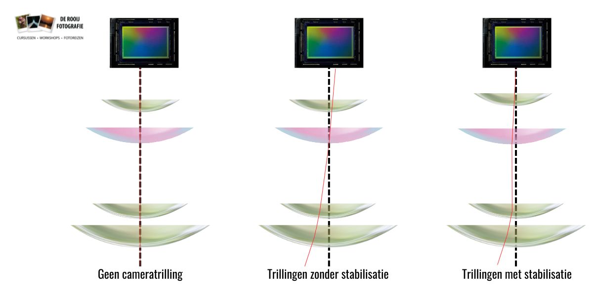 In het objectief zitten meerdere glazen onderdelen waardoor het licht moet reizen om tot de sensor te komen. Enkele glazen elementen zitten niet vast, maar kunnen op basis van trillingen tegenbewegingen maken om de beweging te corrigeren (het roze element in onderstaande voorbeeld). Deze correctie is nodig om de verschillende bewegingen die eerder genoemd zijn op te kunnen vangen. Let wel, het gaat om normaal gebruik. Fotograferen op een hobbelige weg in de auto of met extreme trillingen is minder prettig voor de functie van deze lenselementen. Vaak corresponderen de ingebouwde stabilisatie van het objectief en de camerabody met elkaar.